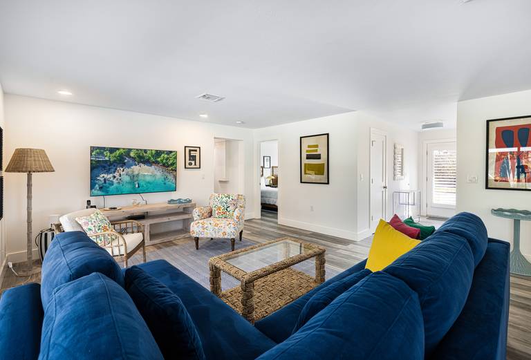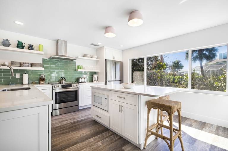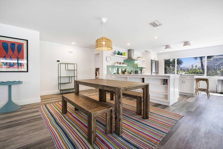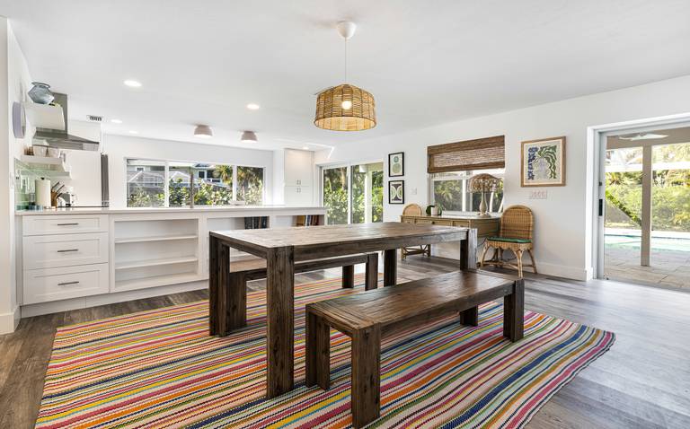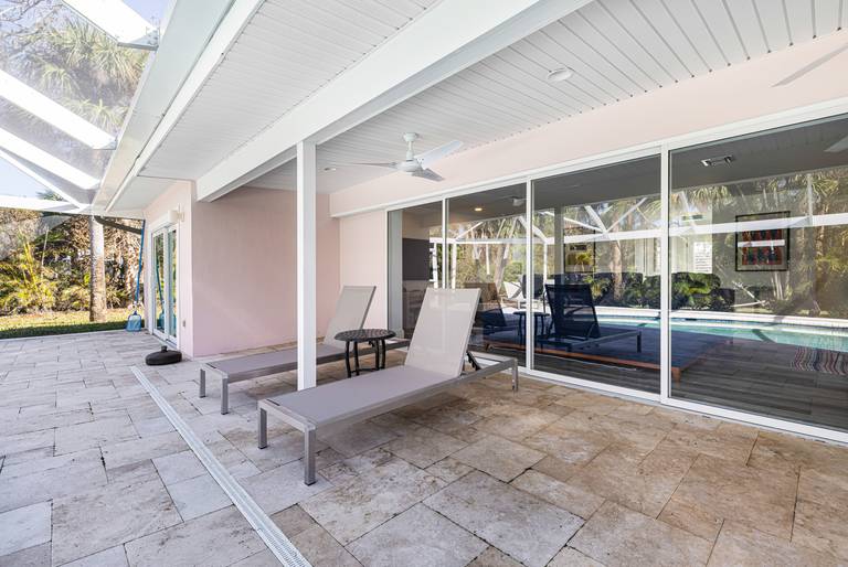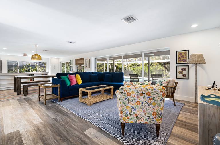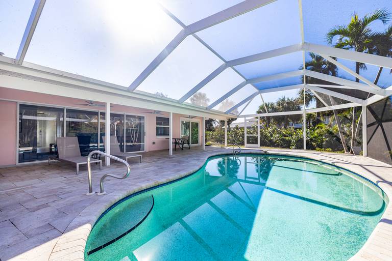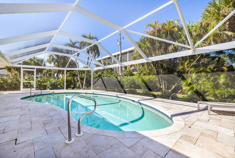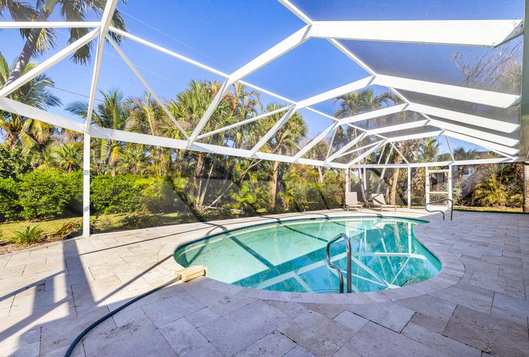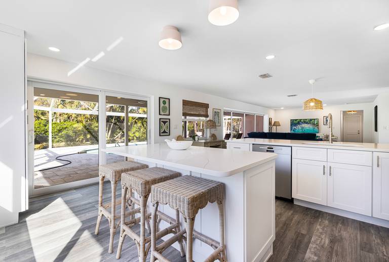 The Allen House is a ground-level 3 bedroom, 3 bathroom home in the desirable West Rocks neighborhood off West Gulf Drive. This home is the perfect island get away. Completely remodeled with all modern amenities and features, you will immediately fall into vacation mode when you enter the spacious open floor plan. After a long day at the beach hunting for Sanibel's famous shells or taking in the warm Gulf breezes, step into the private heated pool or pull up a lounge chair and relax in the large screened-in outdoor patio. The living room, dining room and guest bedroom all open onto this spacious outdoor area.