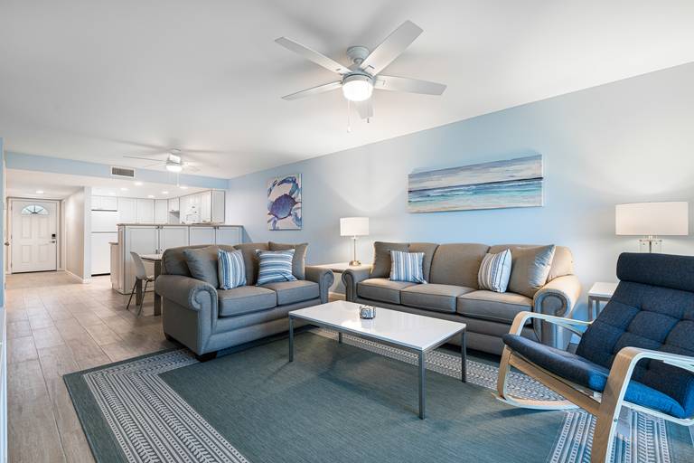 Enjoy all the amenities this unit has to offer such as secure high-speed internet, a smart TV in living room and a well-appointed kitchen with brand new appliances. The primary bedroom has a comfy king bed and en-suite bathroom with a brand new smart TV including a Roku stick. The guest room offers 2 twins with an en-suite bathroom. Beach chairs and umbrella provided.
