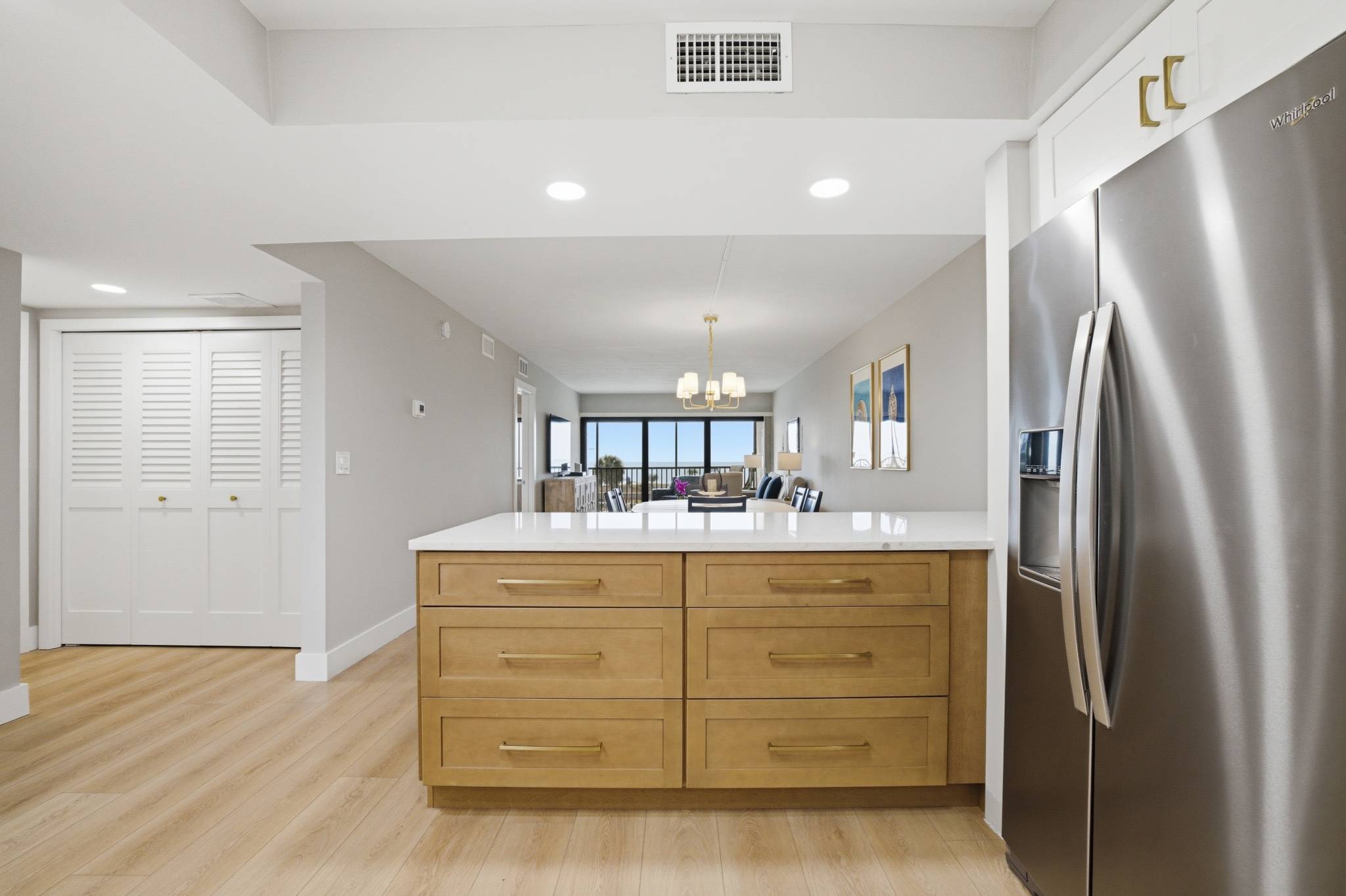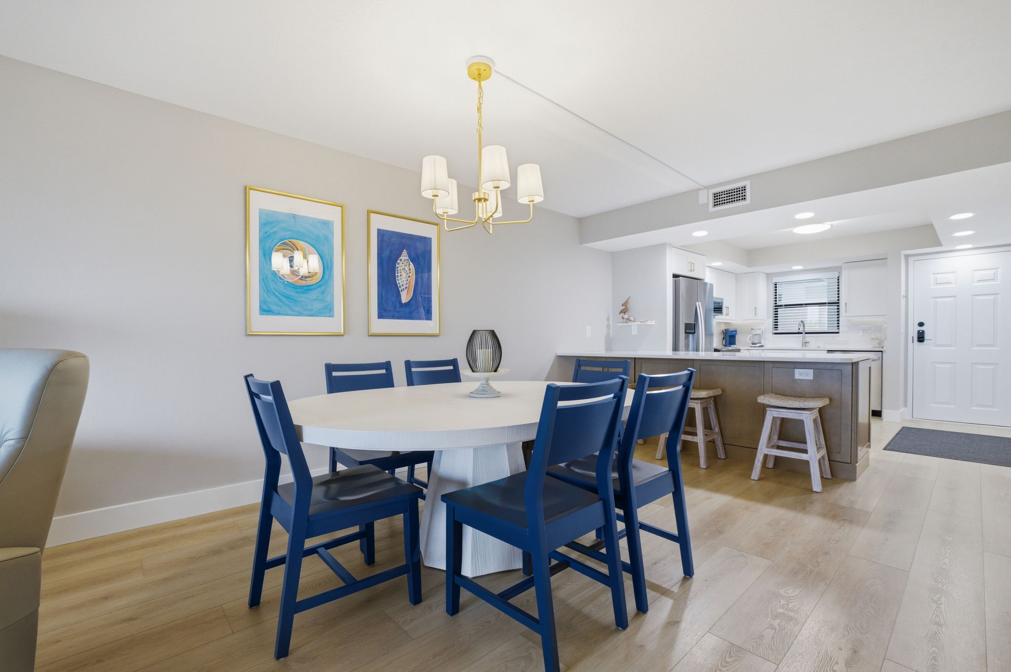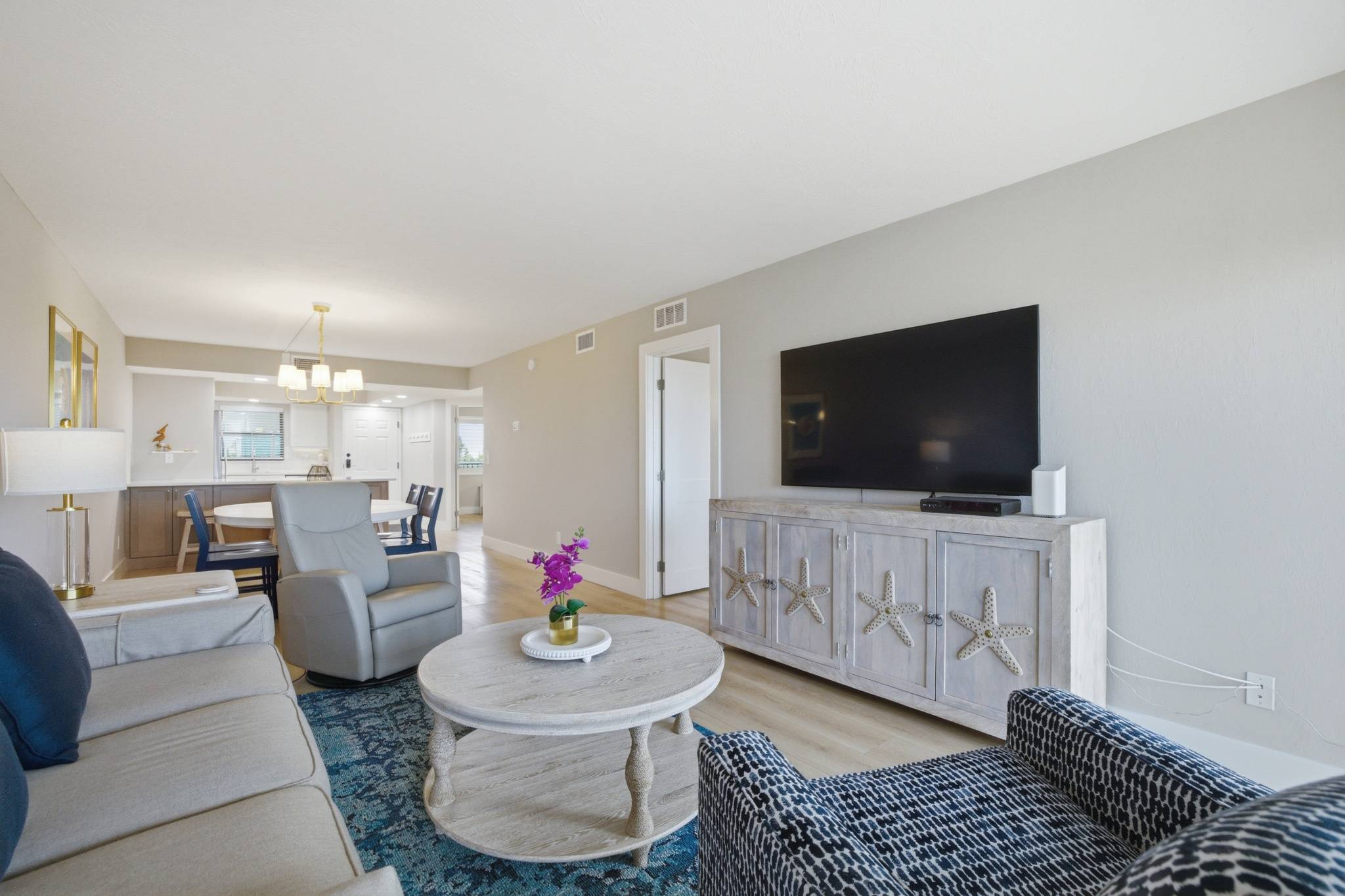 Upon entering this unit you will be greeted with a large open white kitchen with gold touches and everything you'll need to prepare any meal. There is both a pod and drip coffee maker. Relax at the breakfast bar or at the dining table for 6. A the end of a day of collecting shells and sun, enjoy the living room seating area that includes a queen sleeper sofa and large smart TV and watch your favorite shows.