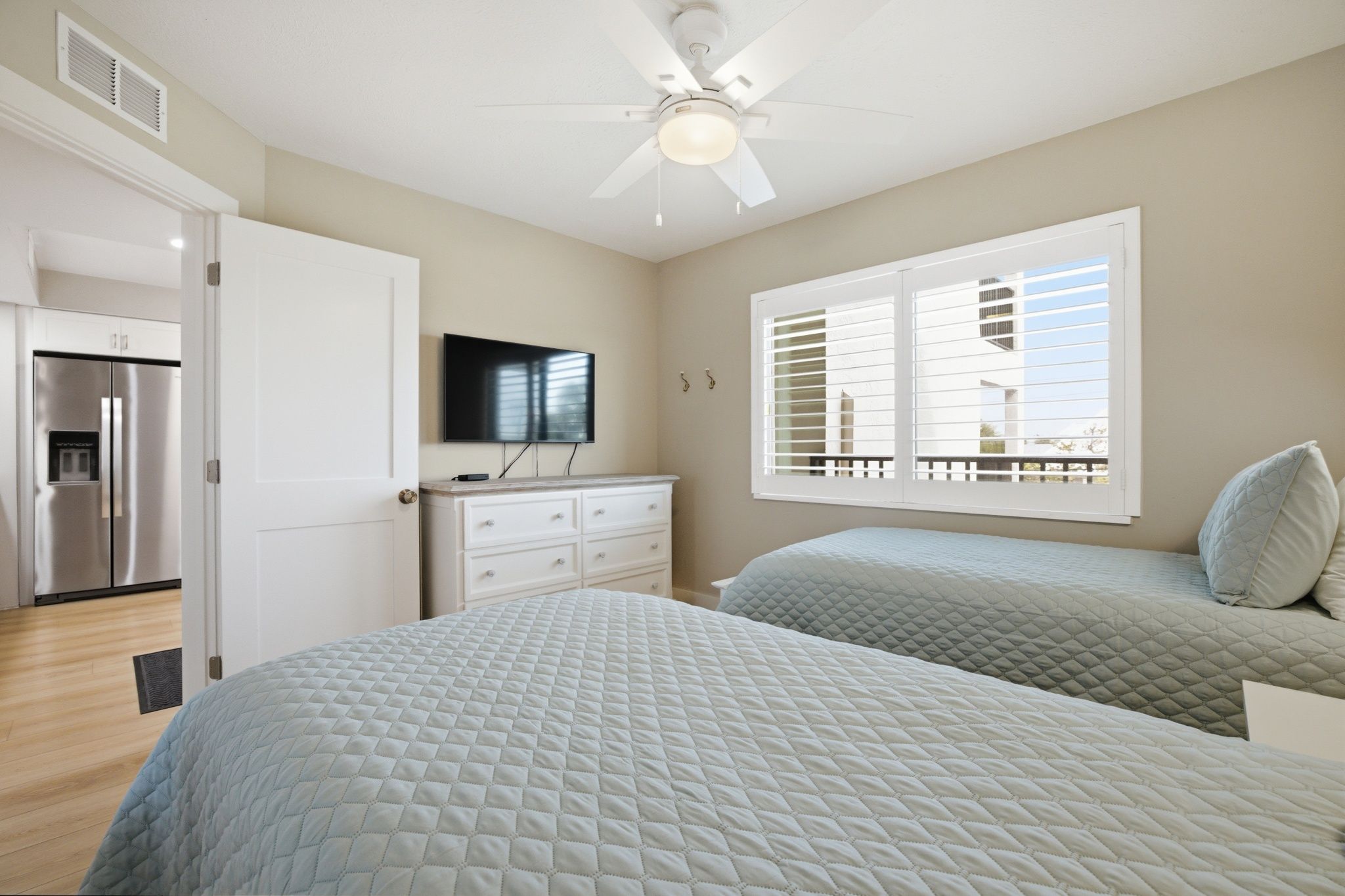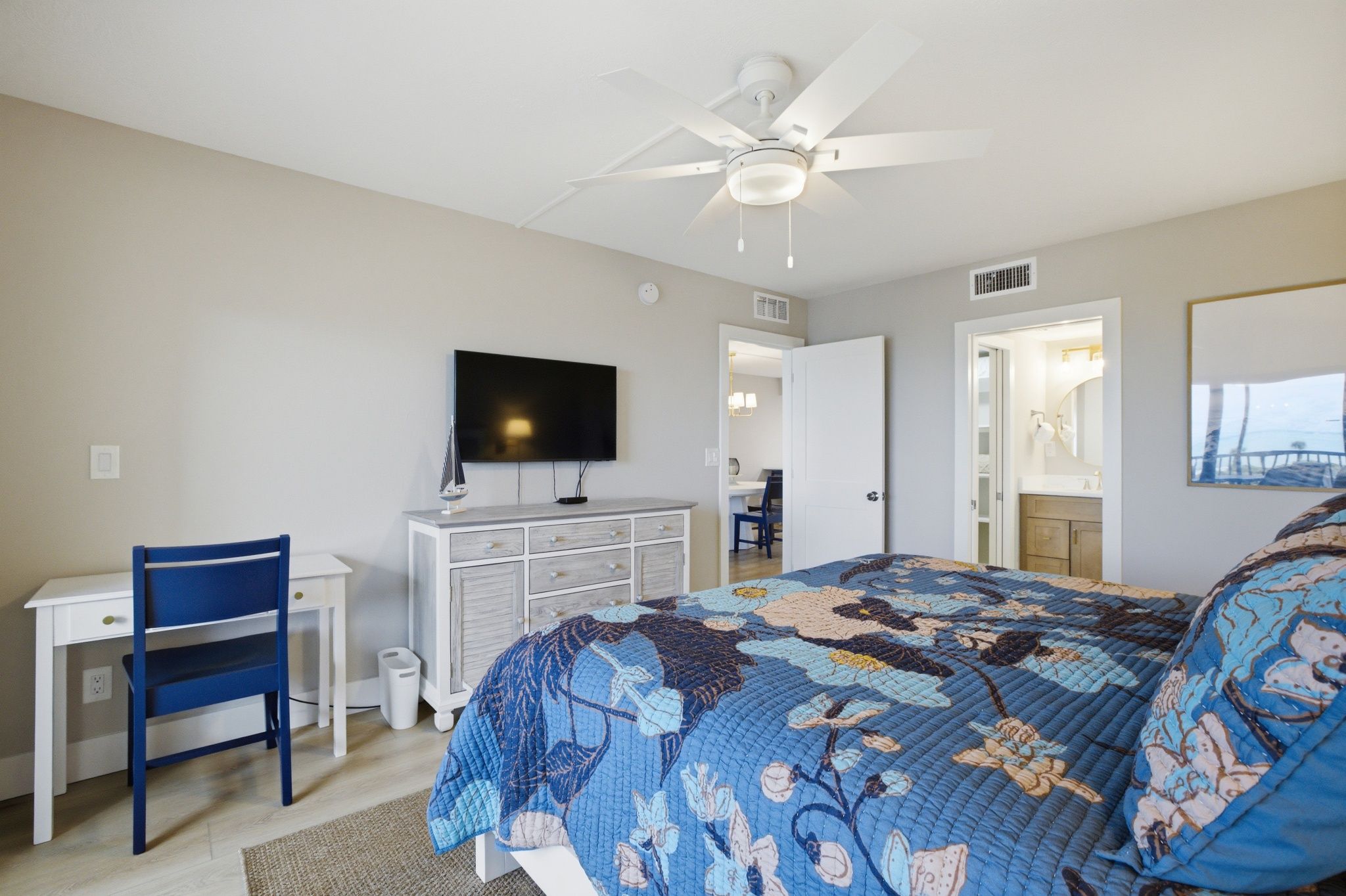The primary bedroom has a king bed, desk, smart TV, large walk in closet and en-suite bathroom with a walk in shower. The guest bedroom provides 2 twin beds, smart TV and nearby bathroom. There is a full size washer & dryer for your convenience. The owner provides 4 beach towels and a storage locker on the ground level with 4 beach chairs and an umbrella.