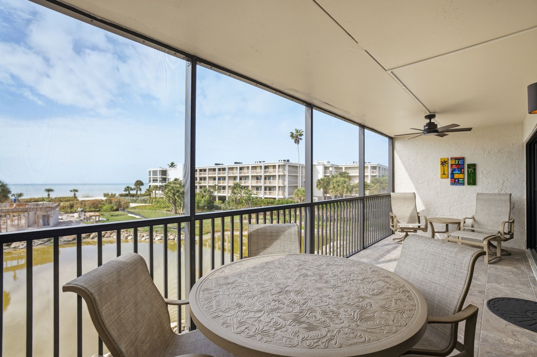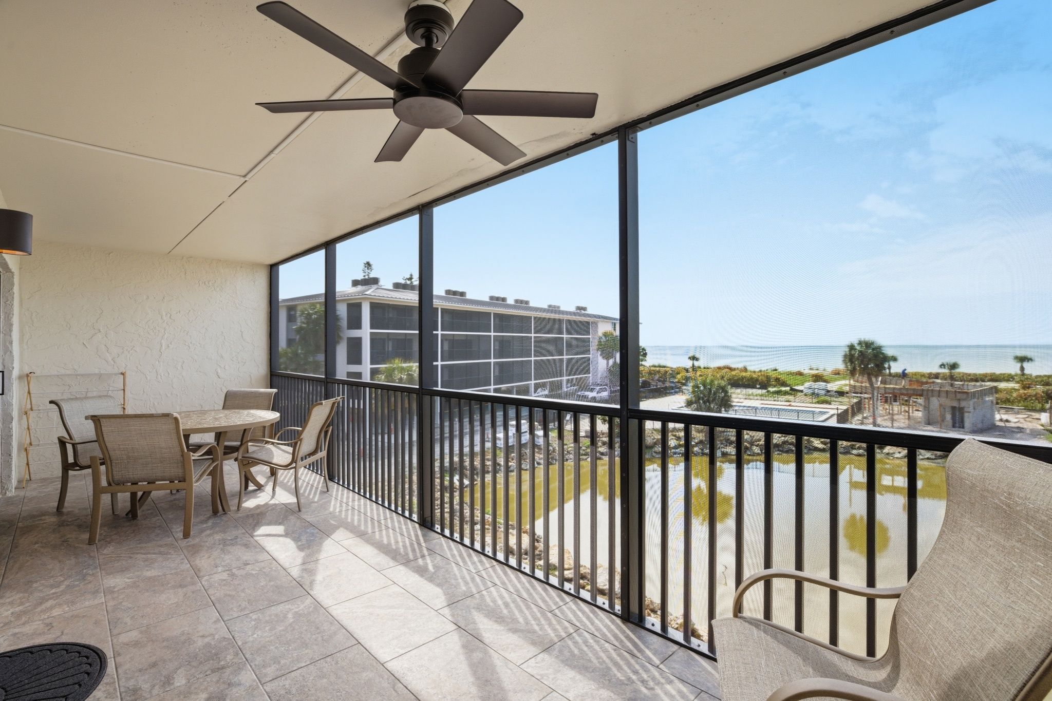 Enjoy breathtaking Gulf views and the salt air from your large lanai (with No-Seeum proof screen!!!) and don't forget to watch the amazing sunset as there is plenty of seating for all to enjoy.
