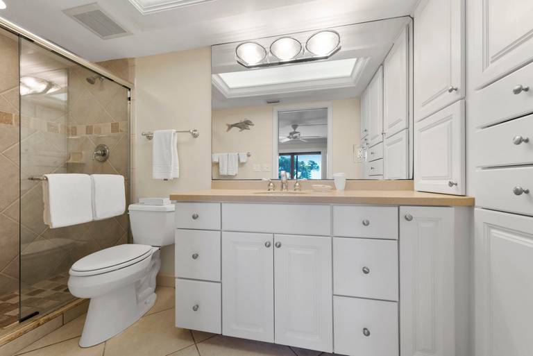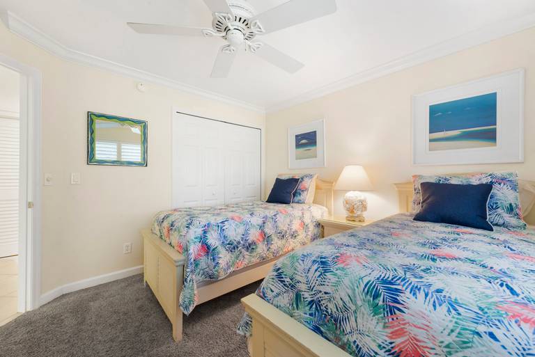 The primary bedroom has a comfortable king size bed and a large smart TV. The en-suite provides you a glass enclosed walk-in shower and plenty of counter space. The guest bedroom has 2 twin beds and a smart TV. The bathroom is just beyond the bedroom door and has a tub/ shower combo.