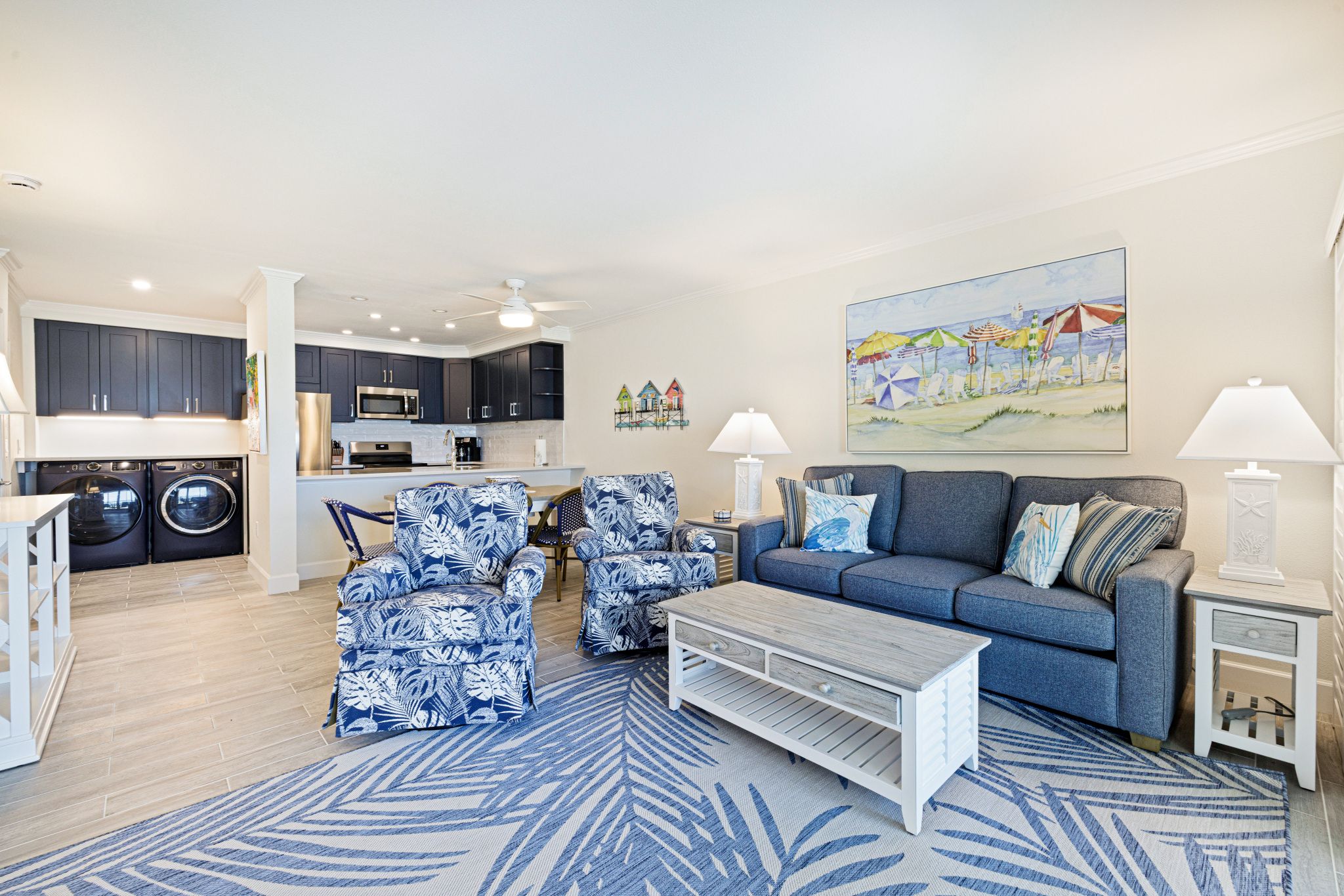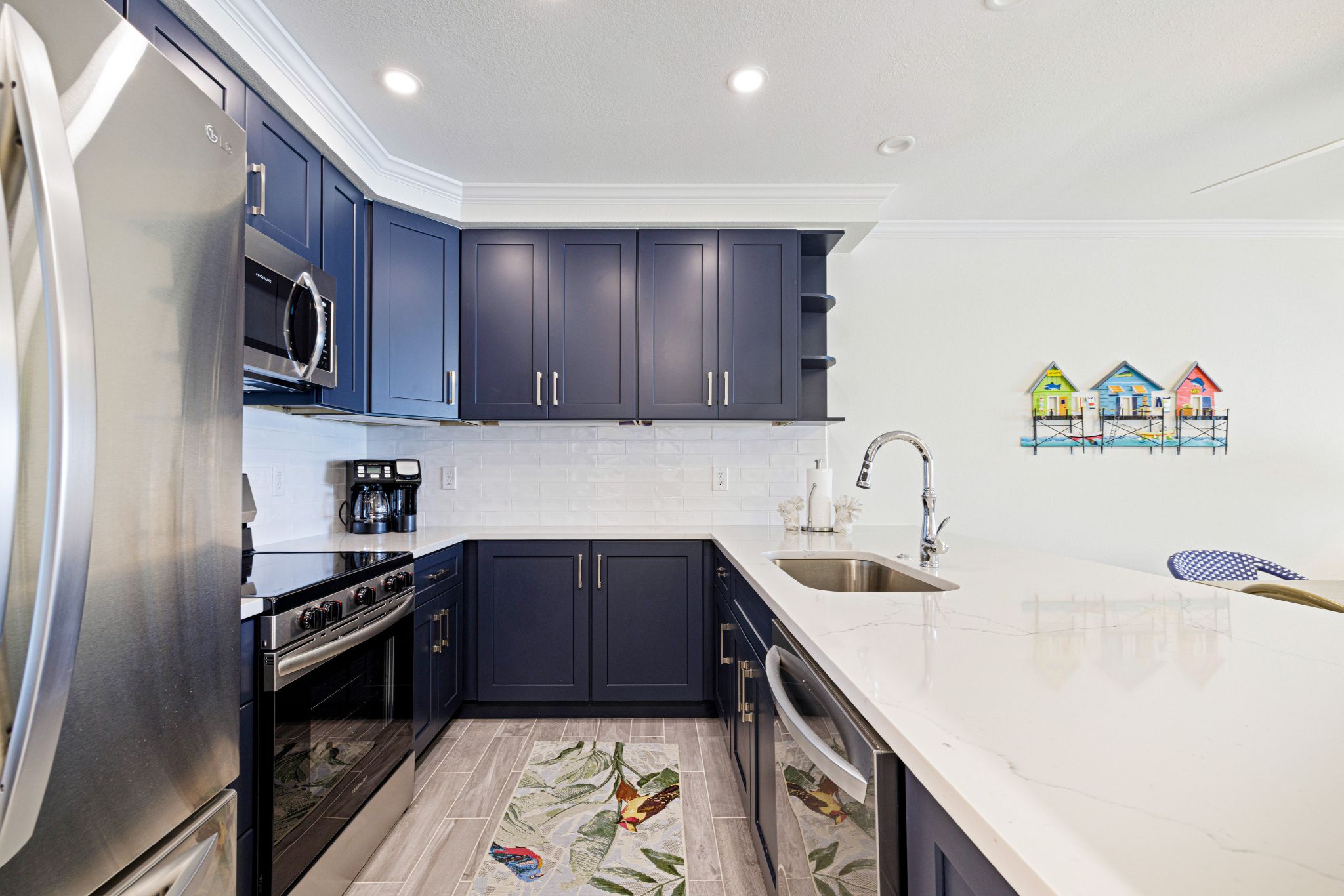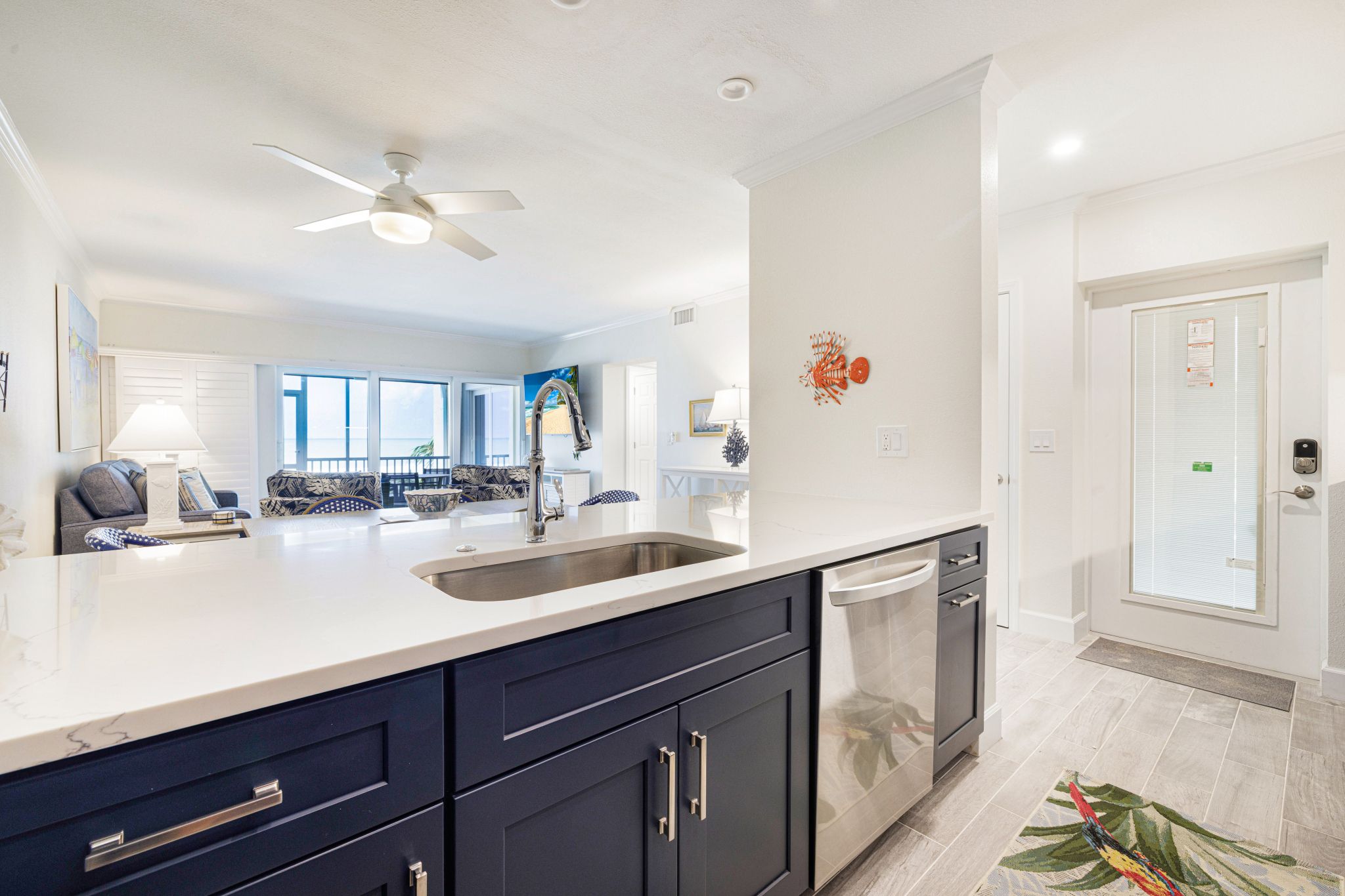 New from the bottom to the top, this ground-level, beautifully appointed, 2 bedroom, 2 bath unit is furnished in chic coastal style. The open concept living space features views of the Gulf of Mexico and is perfect for entertaining or relaxing. Watch the big game or stream your favorite shows on the large smart TV , which, like the 2 TVs in the bedrooms, has 157 LG channels (be sure to bring your login credentials for other options) or host a game night on the spacious dining room table. Prepare gourmet meals in the fully equipped kitchen with stainless steel appliances, quartz counters and gorgeous custom navy cabinets.