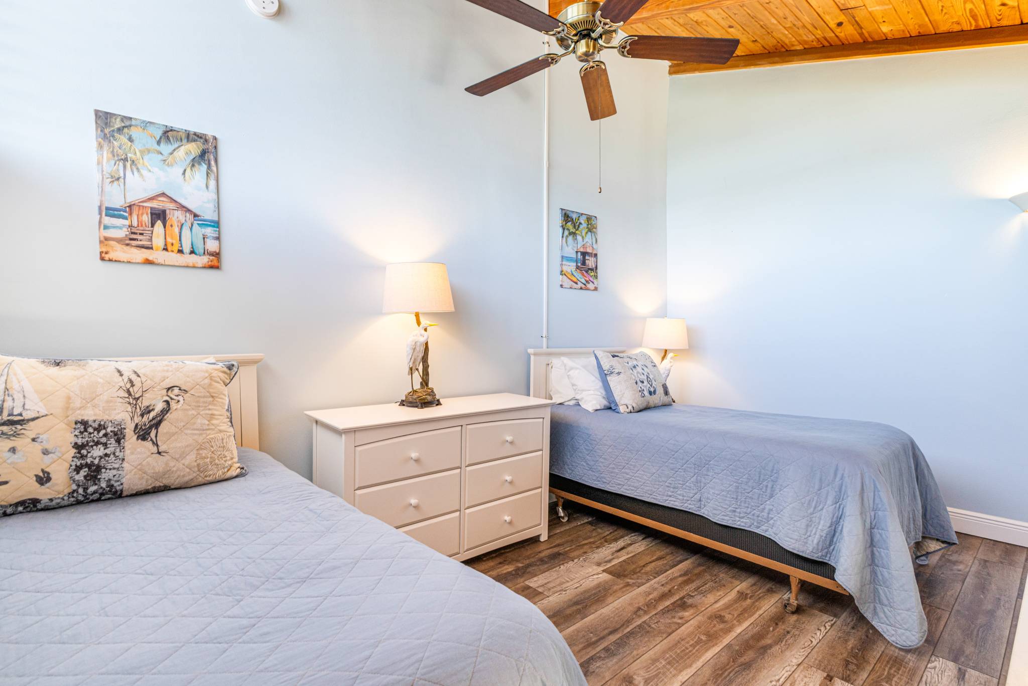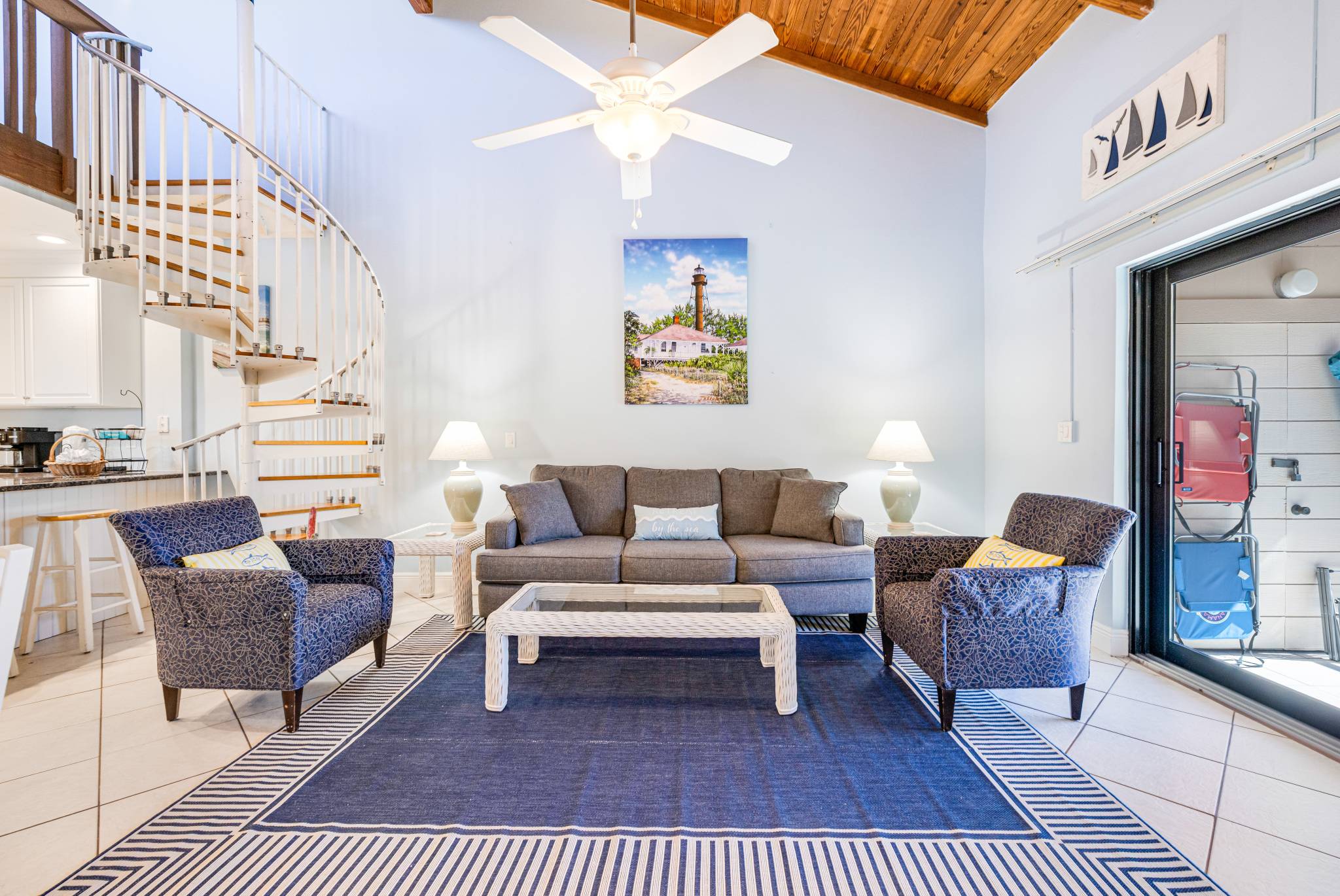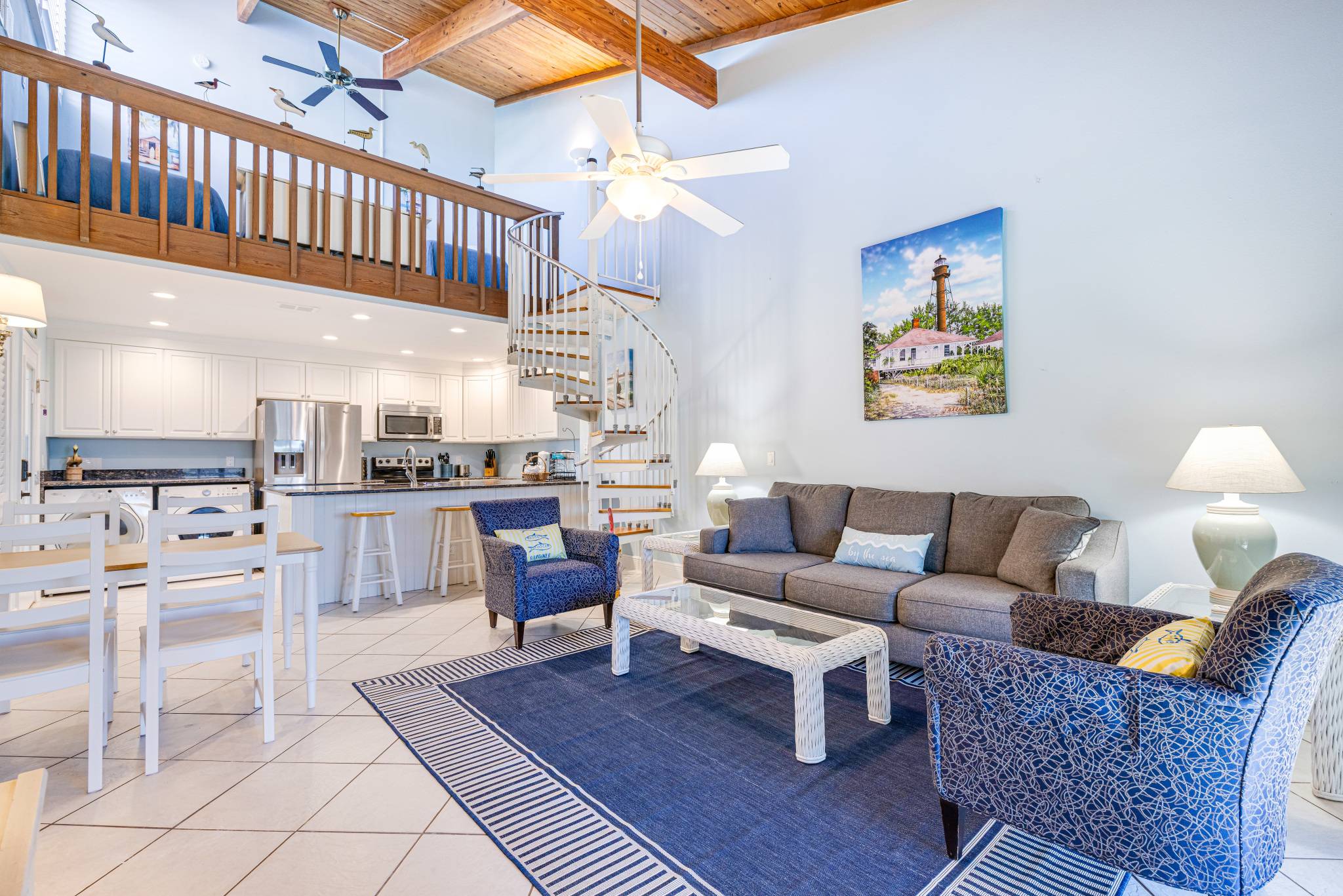 There are 2 bedrooms on the main level, the primary with a king bed and en-suite bathroom and a guest room with a queen bed and a bathroom just outside the door. Additional guests can sleep in comfort in twin beds in the loft area accessible by a spiral staircase just off the dining area.