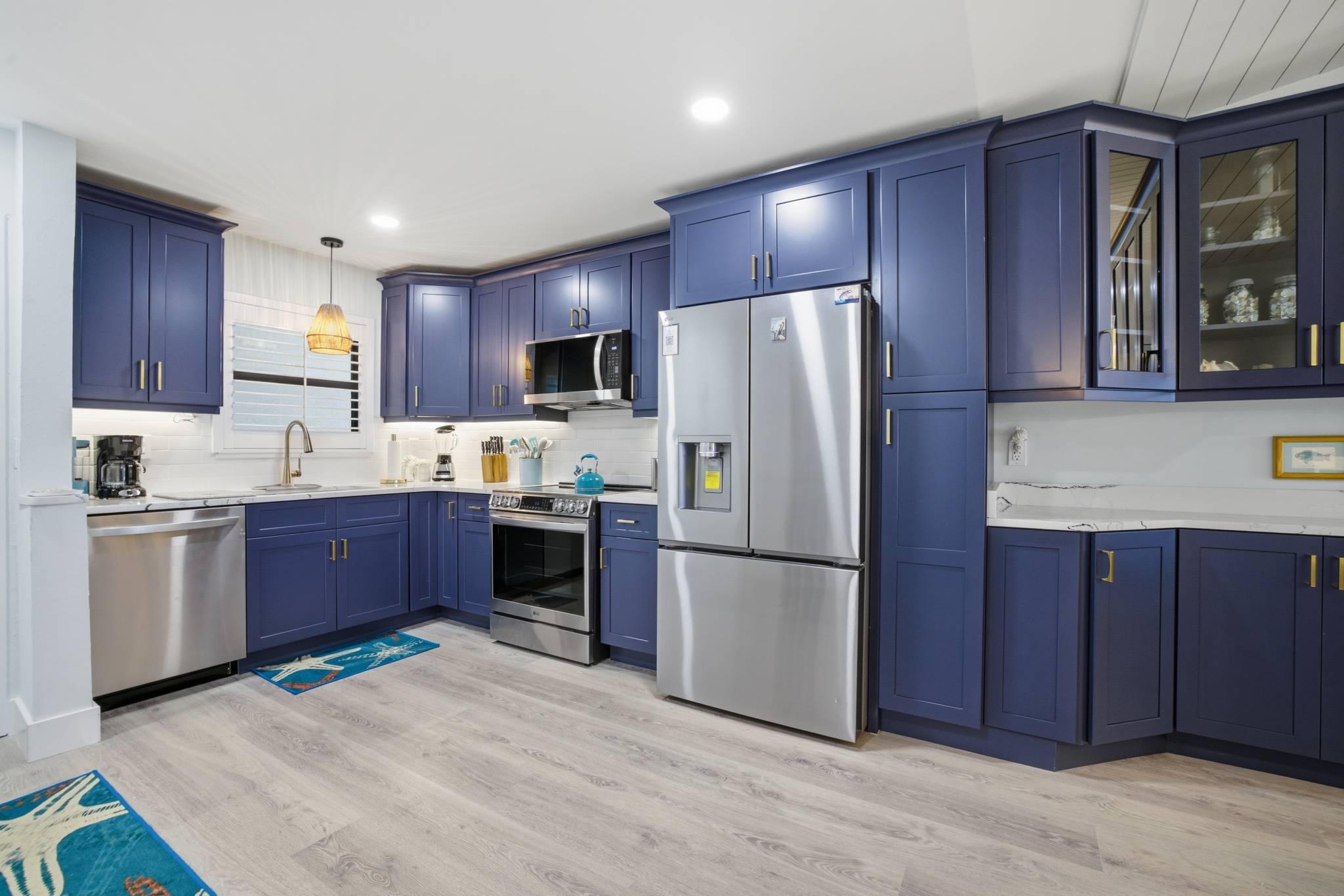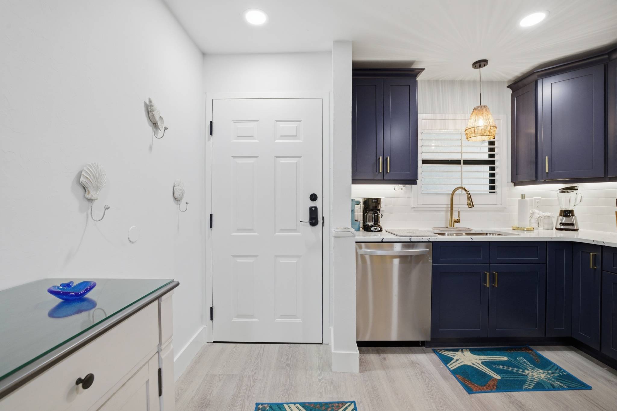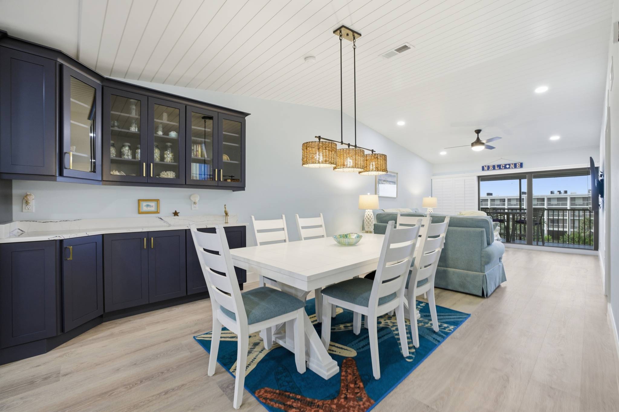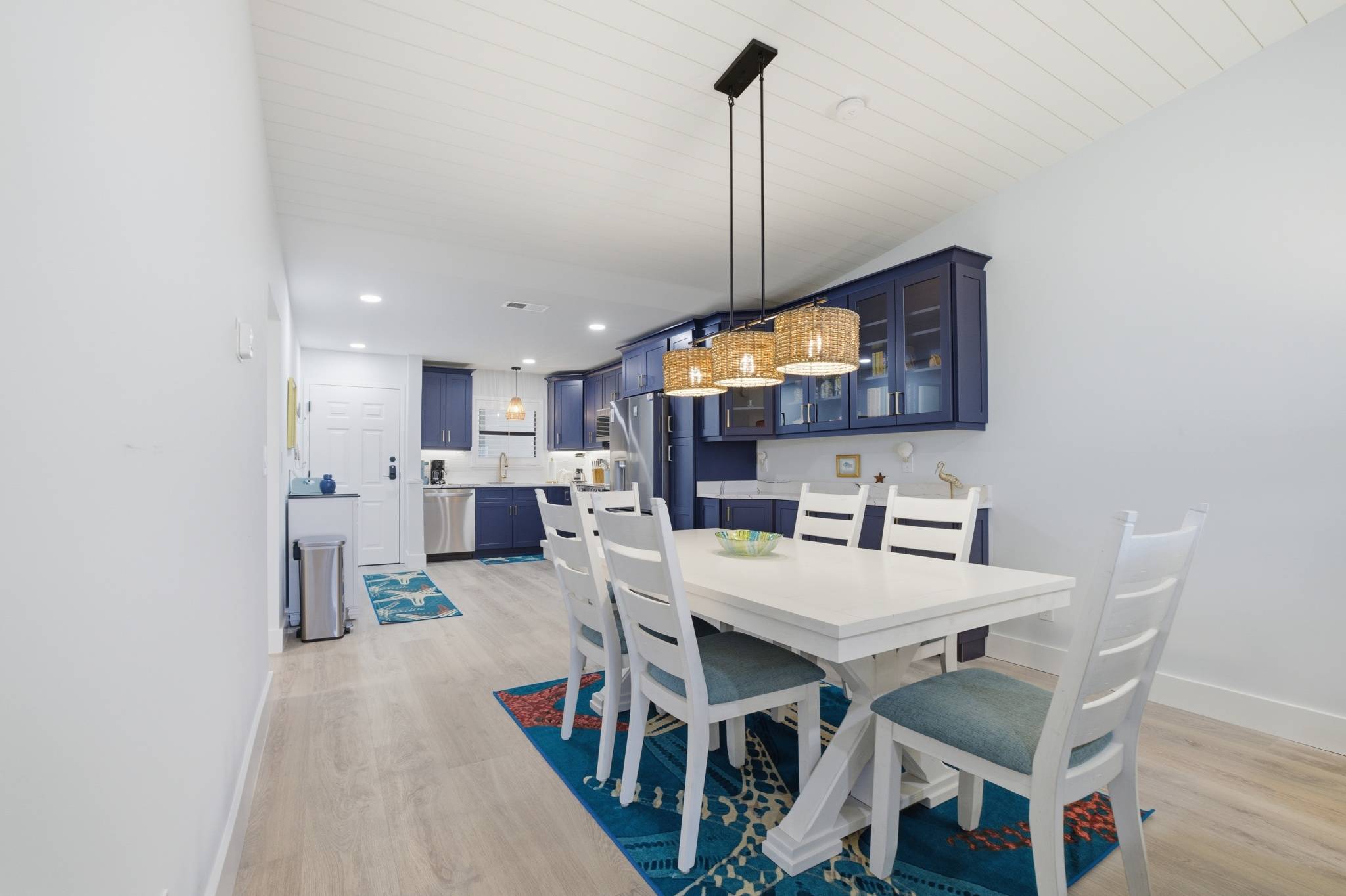 No expense was spared when planning this beautiful condo from the navy blue kitchen cabinets, luxury vinyl plank flooring, wood plank ceiling and gorgeous walk in showers! The chic coastal decor is perfect for your Sanibel holiday!