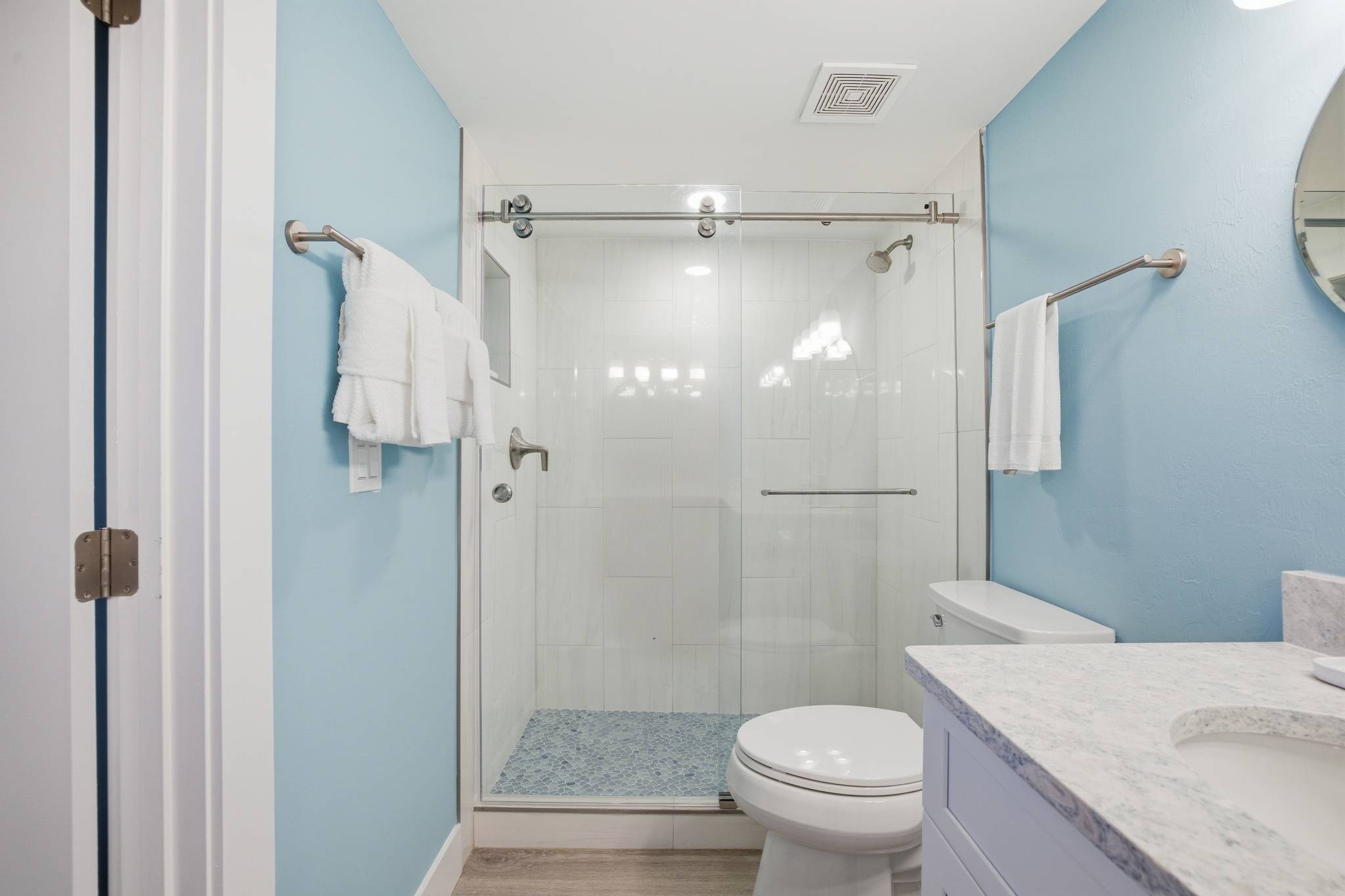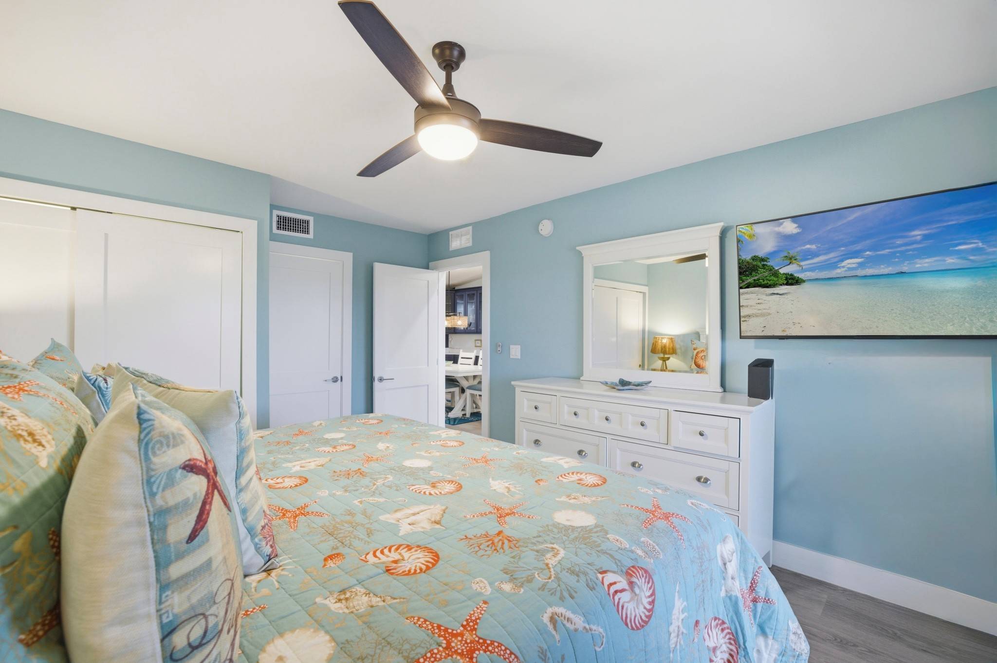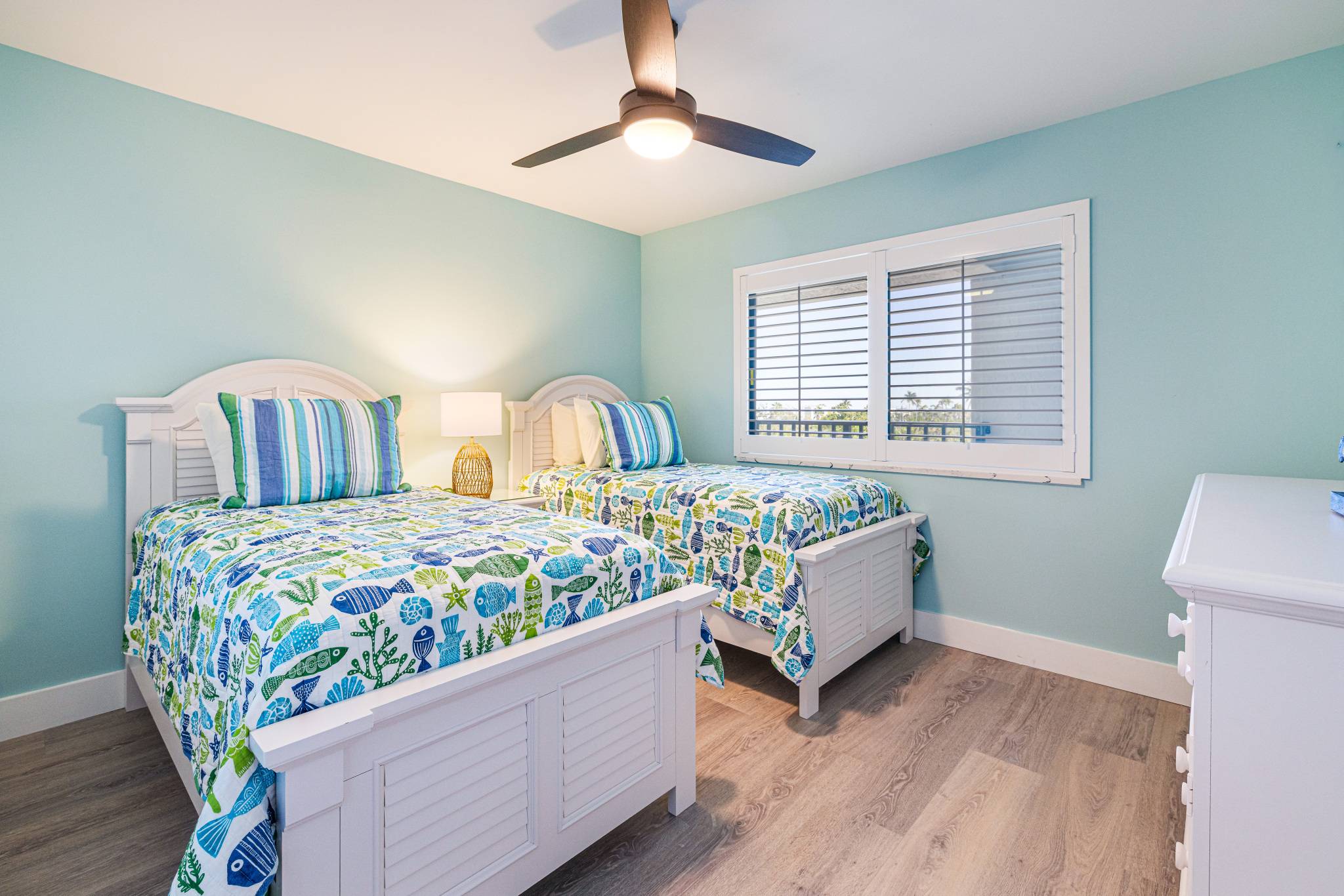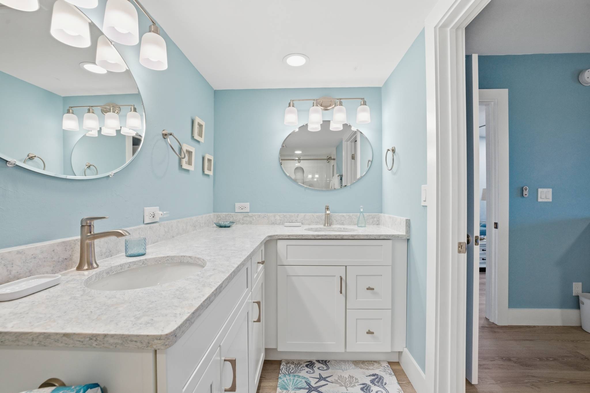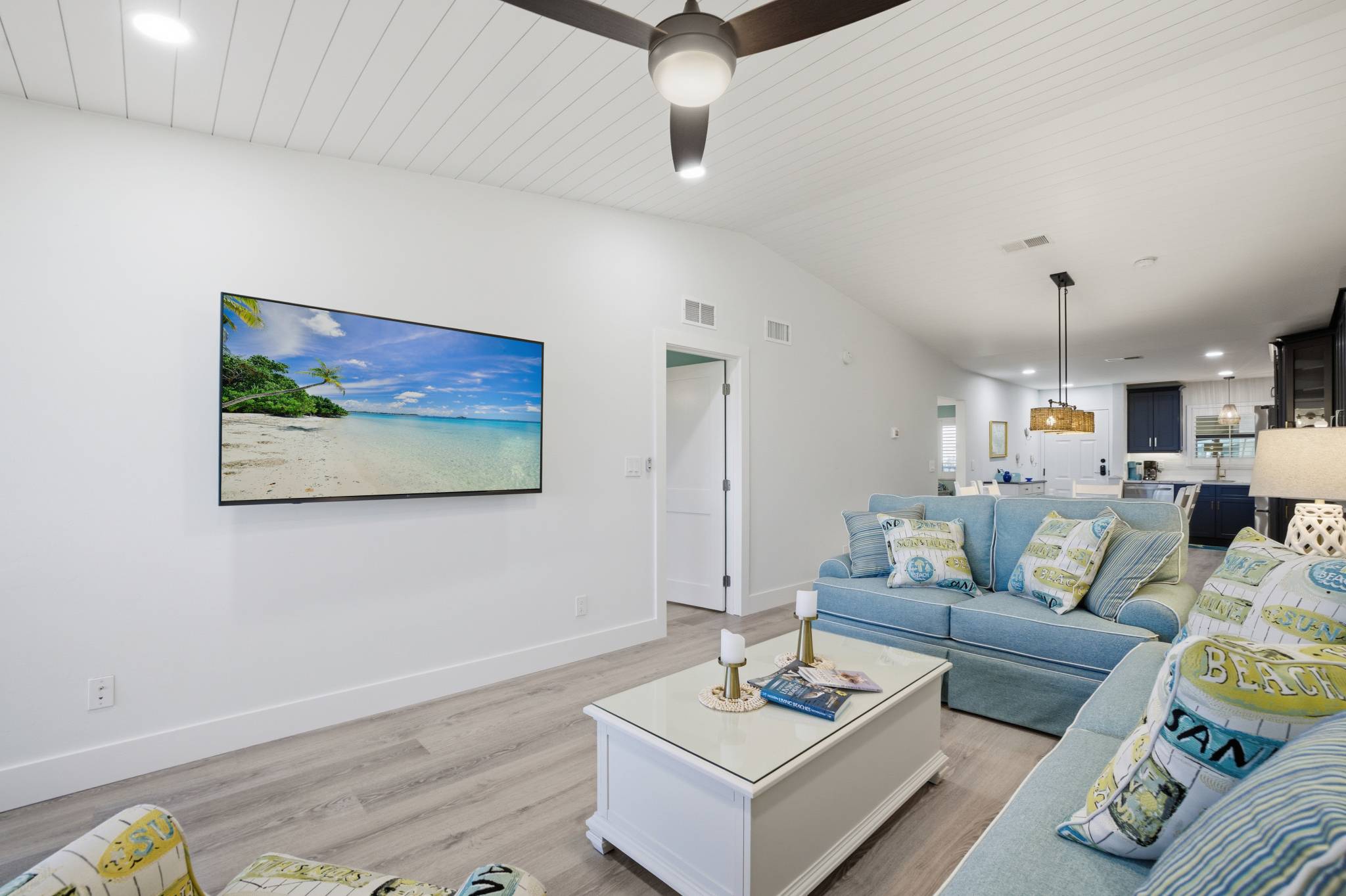 No expense was spared when planning this beautiful condo from the navy blue kitchen cabinets, luxury vinyl plank flooring, wood plank ceiling and gorgeous walk in showers! The chic coastal decor is perfect for your Sanibel holiday!